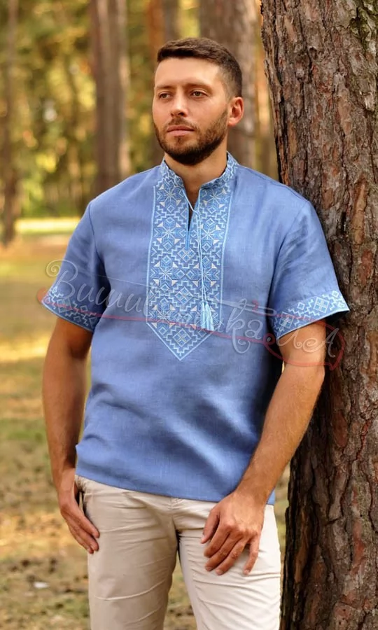Вышиванка из голубого льна М12к