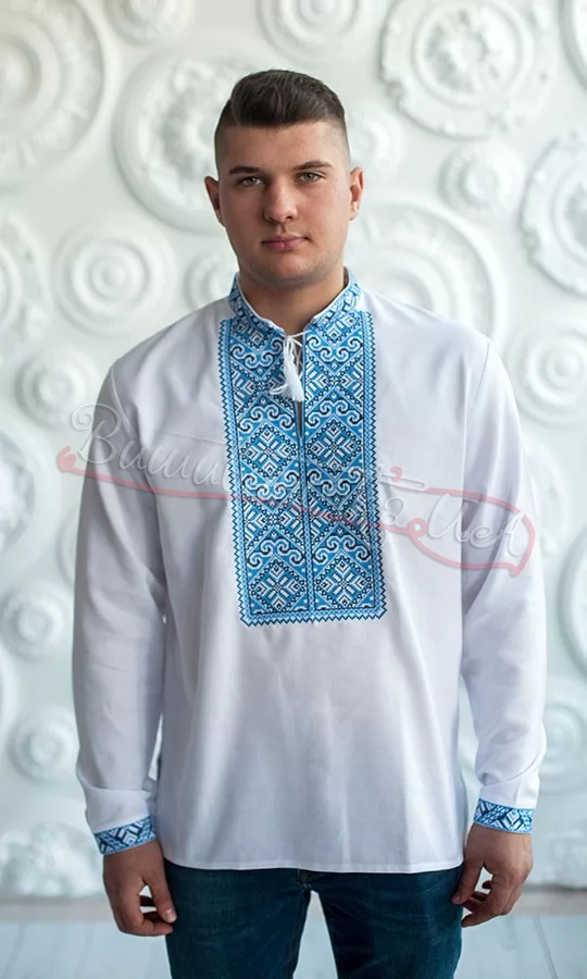 Рубашка мужская из хлопка с длинным рукавом. Яркая синяя вышивка крестиком расположена на груди и манжетах. Такая рубашка хорошо держит форму и не деформируется при стирке. Вышиванка прекрасно подойдет как на каждый день, так и на праздник.