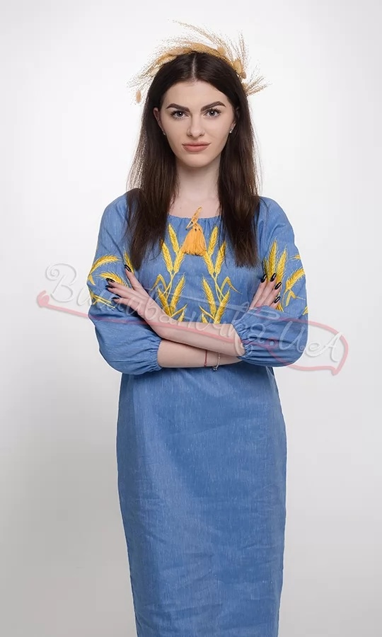Платье голубого цвета с вышитыми колосьями 152-6 - фото vishivano4ka.com.ua