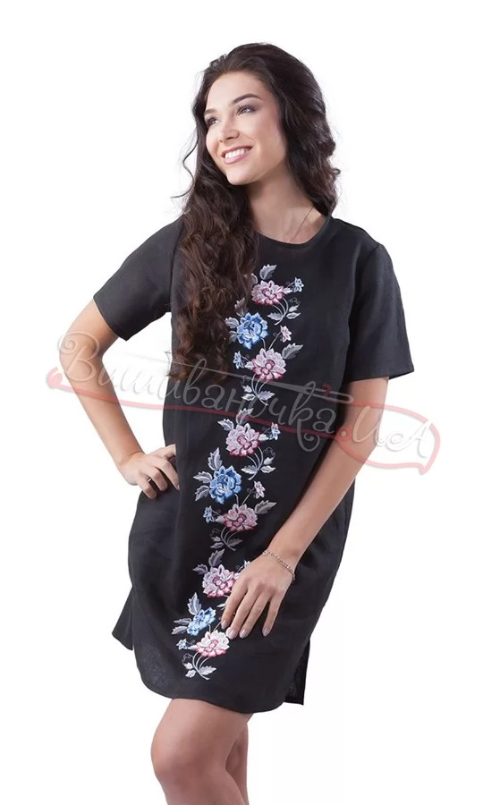 Платье женское черного цвета с вышивкой. Материал – 100% лен.