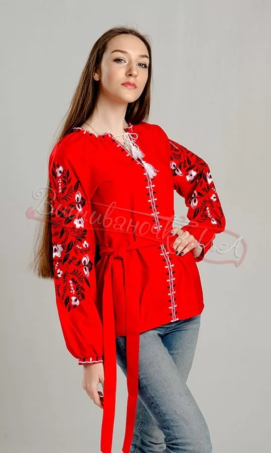 Жіноча вишита блузка червоного кольору з квітковим орнаментом. Тканина – 52% поліестер, 48% бавовна. У комплекті є пояс. Вишиванку можна поєднувати як із традиційною спідницею, так із джинсами.