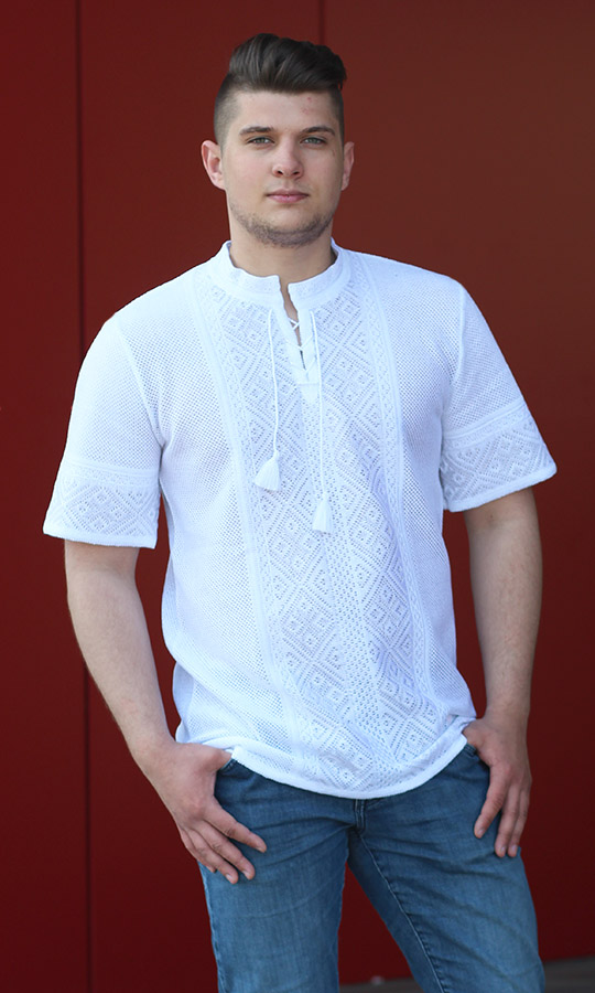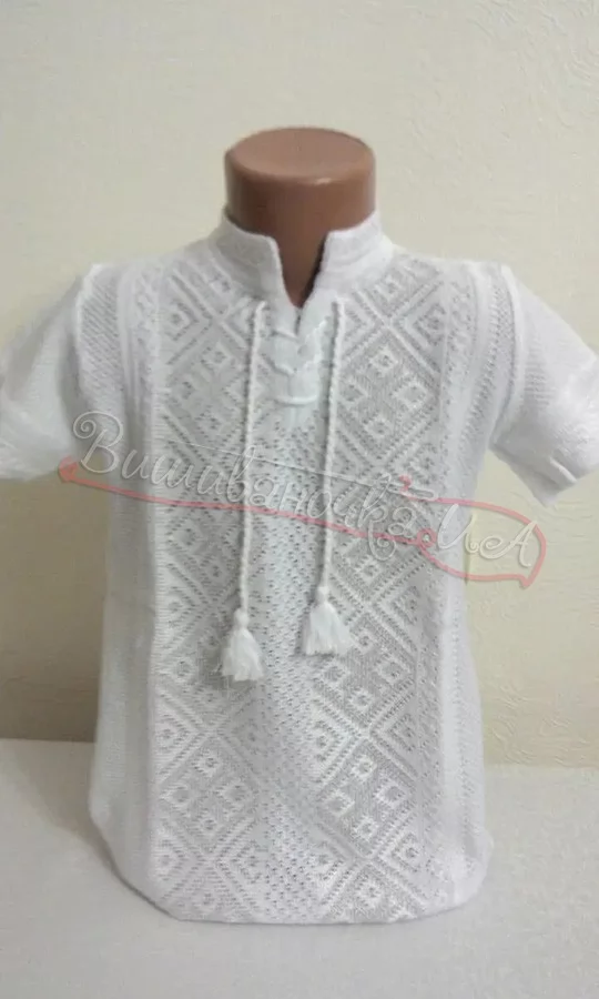 Легкая детская футболка-вышиванка на мальчика. В узоре сочетание белого и светло-серого цвета нити. Материал – хлопок, машинная вязка. Выглядит очень празднично и нарядно, подойдет для любого праздника или для школы. Стирать при температуре 35-40°.