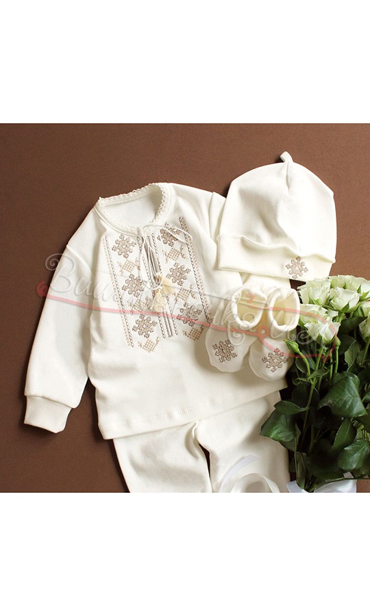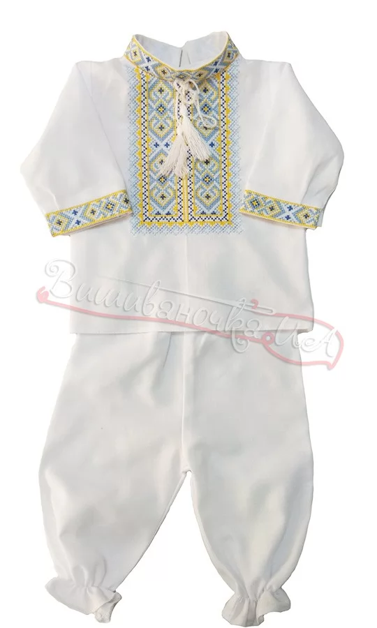 Набір для хрещення хлопчика складається з вишиванки та штанців на резинці. Тканина - 62 % бавовна та 38 % поліестер. Вишиванка вільного прямого крою забезпечить комфорт вашому малюку. Патріотична жовто-блакитна вишивка прикрашає перед сорочки та манжети. Вишиванка має невеликий комірець-стійку та зав'язки білого кольору. Святковий варіант одягу на виписку або хрестини.