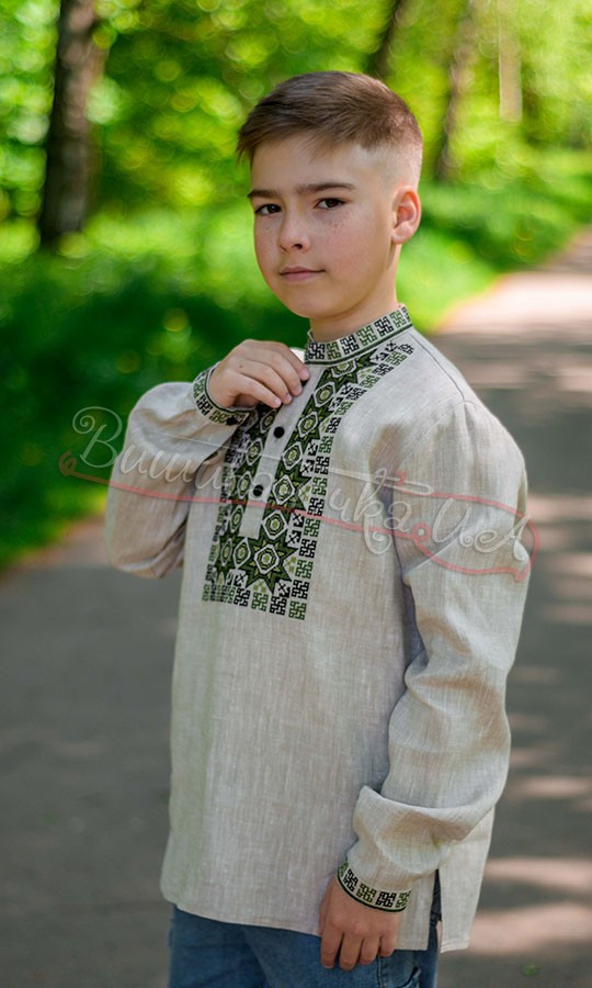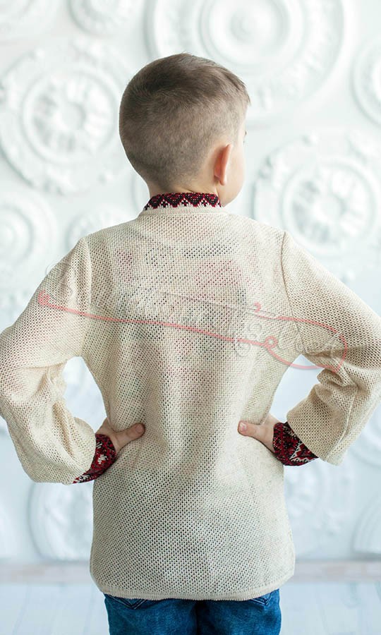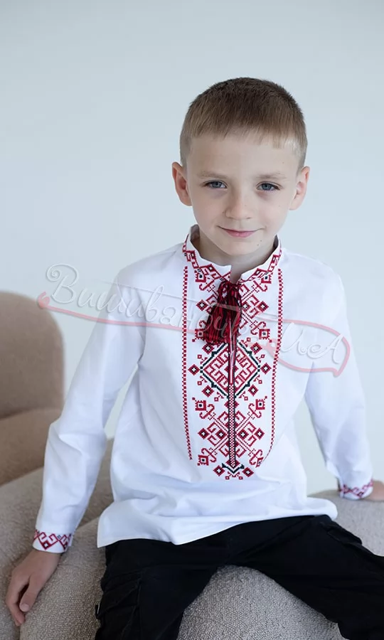 Вишиванка для хлопчика з бордовим Орнамент. Тканина – 52% бавовна, 48% поліестер. Вишивка – машинна хрестиком.