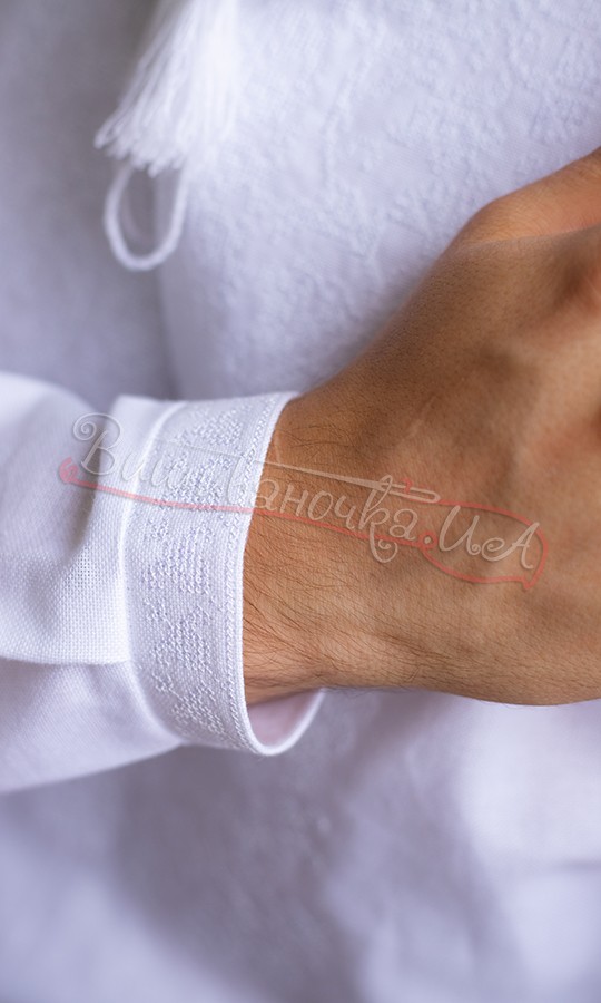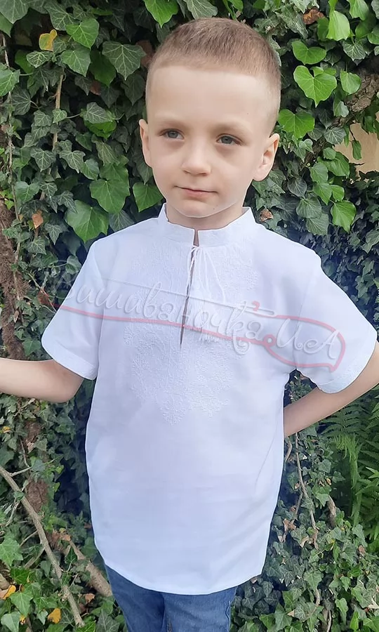 Вышиванка для мальчика на коротком рукаве с белым узором. Вышивка – машинная крестиком. Узор расположен на груди и манжетах. Воротник стойкой, на горловине завязки белого цвета.