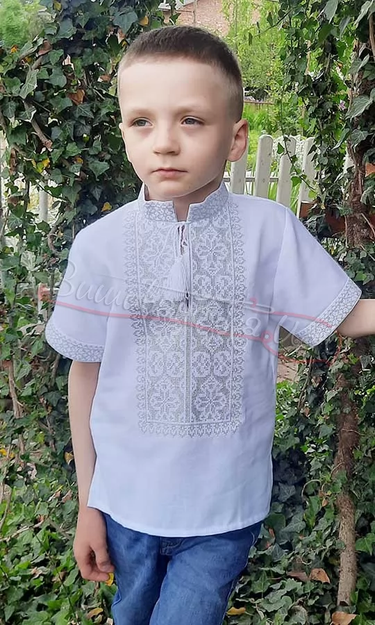 Вышиванка для мальчика с коротким рукавом с нежным узором в серых тонах. Вышивка – машинная крестиком. Узор расположен на груди и манжетах. Воротник стойкой, на горловине завязки белого цвета.