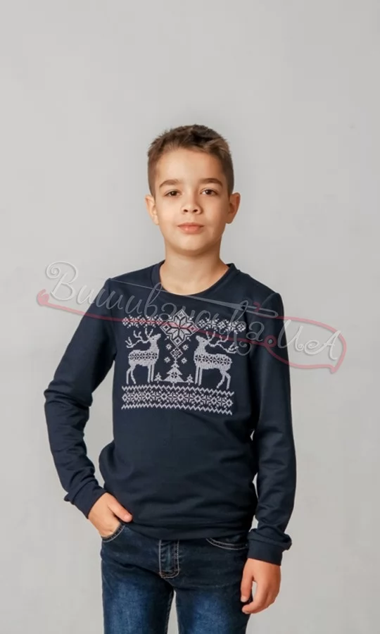 Кофта для хлопчика темно-синього кольору. Вишивка - машинна, із зображенням оленів. Стильне та святкове вбрання для Новорічних свят.
