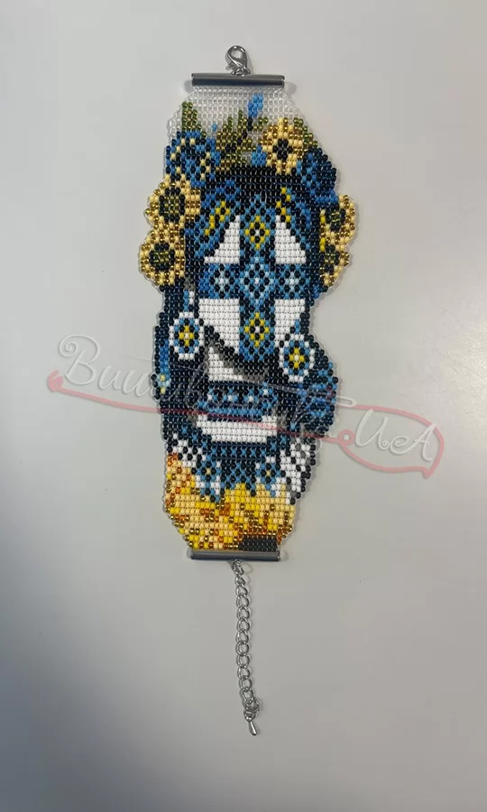 Браслет з етно-мотивами за схемою Ольги Сенюк. Довжина - 16 см + ланцюжок, ширина - 7 см.