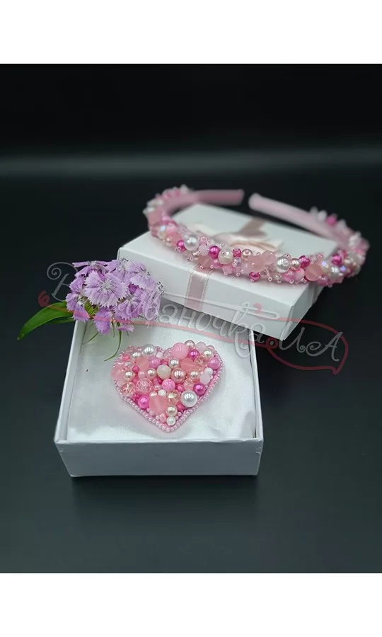 Брошка у вигляді серця зроблена з бісеру та скляних намистин. Розмір брошки 5*5 см. Обруч виконаний з намистин та чеського кришталю. Розмір обруча універсальний, ширина 1,5 см.