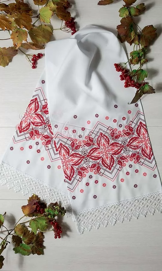 Український обрядовий рушник з мереживом, вишивка хрестиком червоними нитками. Тканина - бавовняна. Розмір 150*31 см (+-0,5 см). Ціна за набір (2 шт).