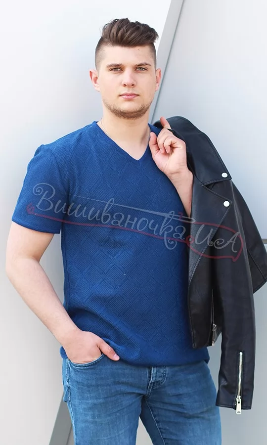 В'язана чоловіча вишиванка - футболка синього кольору з V- подібним вирізом, машинна в'язка. Модель приємна у носінні як у спекотну, так і в прохолодну погоду. Після прання при 35-40 с° матеріал зберігає первинний вигляд та форму. Можливе індивідуальне пошиття.