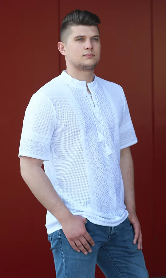 Вязана біла чоловіча вишиванка з бавовни 5309