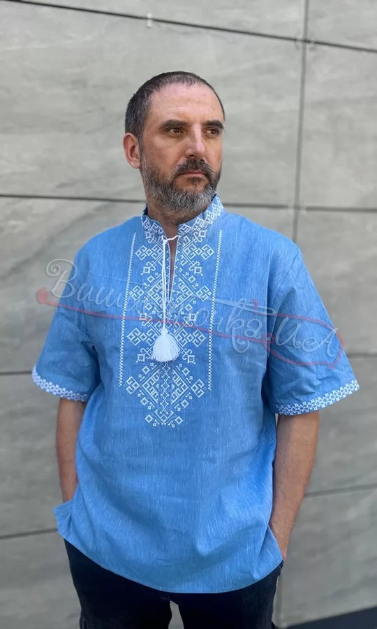 Чоловіча вишиванка блакитного кольору з білим узором на короткий рукав. Тканина - 60% бавовна, 40% льон. Модель прямого крою з коміром на стійці, вирізом з зав'язками-кутасиками. Вишиванка доповнить ошатний гардероб та гарно підійде до будь-якого низу.