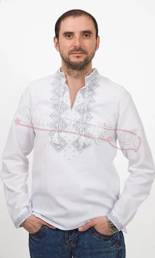 Чоловіча вишита сорочка з довгим рукавом. Гарний класичний покрій, натуральний матеріал бавовна і витончена машинна вишивка хрестиком геометричного узору по основі сорочки надають вишиванці оригінальний і неповторний вигляд. Вишиванка чудово підійде на святкові події, адже вишивка створена світло-сірими нитками.