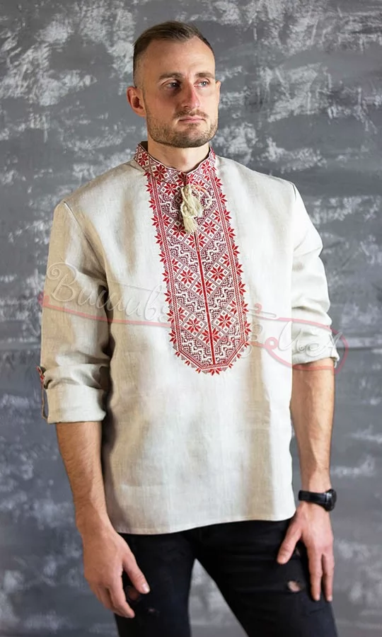 Чоловіча вишиванка із льону з пат-манжетом 316-4+