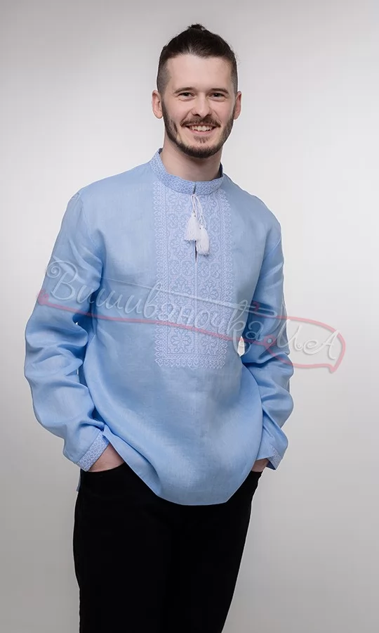 Вишита чоловіча сорочка з льону з комірцем-стійкою. Колір тканини - світло-блакитний. Колір вишивки - білий.
