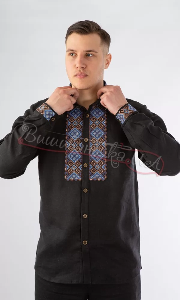 Стильна та колоритна чоловіча вишита сорочка із льону чорного кольору. Сучасний крій з ґудзиками та відкладним коміром. Вишивка - машинна хрестиком по основі сорочки. Гарно виглядає як із брюками, так і з джинсами. Відмінний подарунок собі, другові чи родичу.