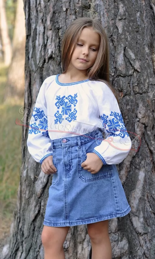 Вишита дитяча блуза з довгим рукавом. Матеріал - 100% льон. Колір тканини - білий. Колір вишивки - насичений синій. У візерунку використані елементи слов'янської вишивки, а саме символ Лілії, яка уособлює дівочу красу, чарівність, а також є оберегом від хвороб.