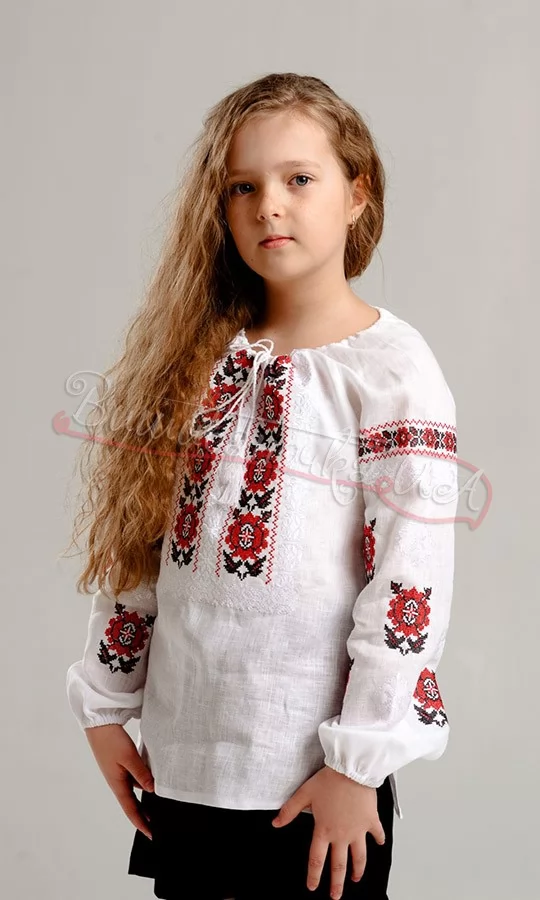 Дитяча вишита сорочка білого кольору. Квітковий узор в червоно-чорних тонах прикрашає рукава та перед вишиванки. Горловина на зав'язках, з білими китицями.