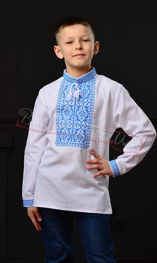 Вишиванка для хлопчика з яскравим блакитним орнаментом. Вишивка - машинна хрестиком. Узор розміщений на грудях та манжетах. Доповнюють сорочку китиці білого кольору на горловині.