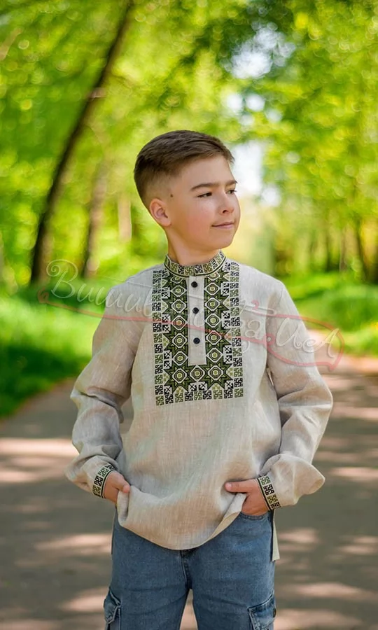 Сорочка для хлопчика в сірому кольорі. Тканина - льон. Вишивка - машинна хрестиком, покриває повністю комір і манжети, передню частину сорочки.