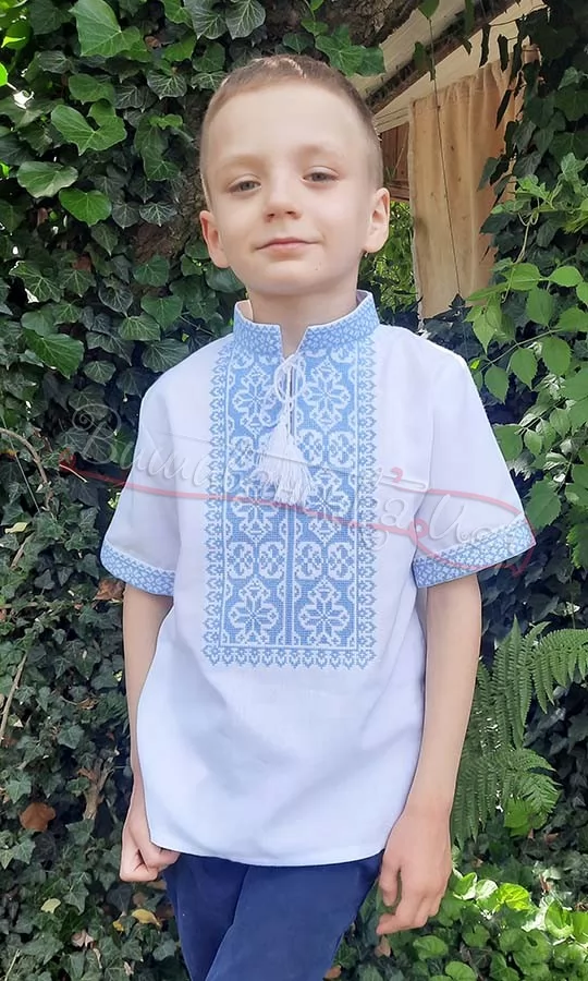 Вишиванка для хлопчика на короткий рукав з ніжним узором блакитного кольору. Вишивка - машинна хрестиком. Узор розміщений на грудях та манжетах. Комірець стійкою, на горловині китиці білого кольору.