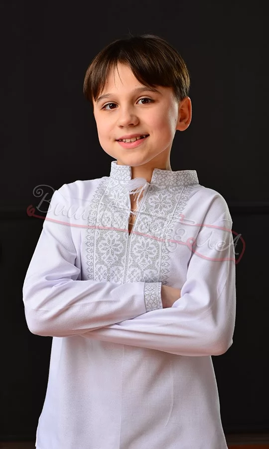 Вишиванка для хлопчика з ніжним узором в сірих тонах. Вишивка - машинна хрестиком. Узор розміщений на грудях та манжетах. Комірець стійкою, на горловині китиці білого кольору.