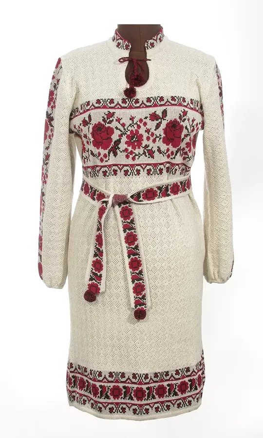 В'язана жіноча сукня з льону, червоний квітковий орнамент.