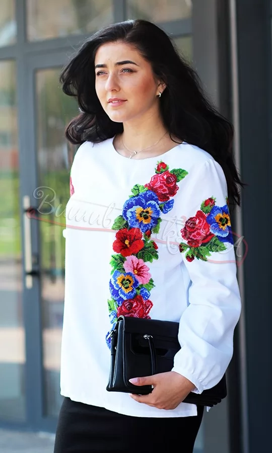 Вишиванка жіноча вишита чеським бісером на бавовні. Візерунок у вигляді квітів троянд, братиків та мальв розміщені вертикальним узором з лівої сторони  і на рукавах. Блузка виготовляється ручною вишивкою під замовлення, термін виготовлення 3-4 тижні. Замовлення вважається здійсненим після внесення 20% від вартості виробу або 100% оплаті . Також Ви можете купити вже вишиту, але не розкроєну і не зшиту вишиванку, щоб зшити її під себе. В такому випадку Вам буде надана знижка в сумі 250 грн на пошиття.
