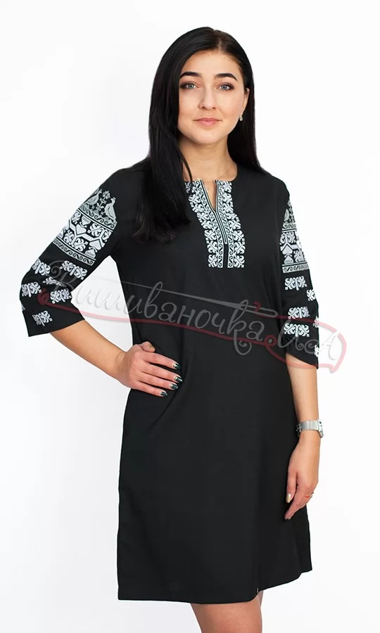 Стильне чорне плаття з національним колоритом. Модель має зручний вільний крій з 3/4 рукавами, вертикальним вирізом на горловині, виточками на спині та зручними кишенями. Тканина - віскоза, вишивка - машинний хрестик. Контрастне поєднання кольору вишивки та тканини робить образ ефектним. Розмірна таблиця допоможе краще зорієнтуватися в обранні вірного розміру.