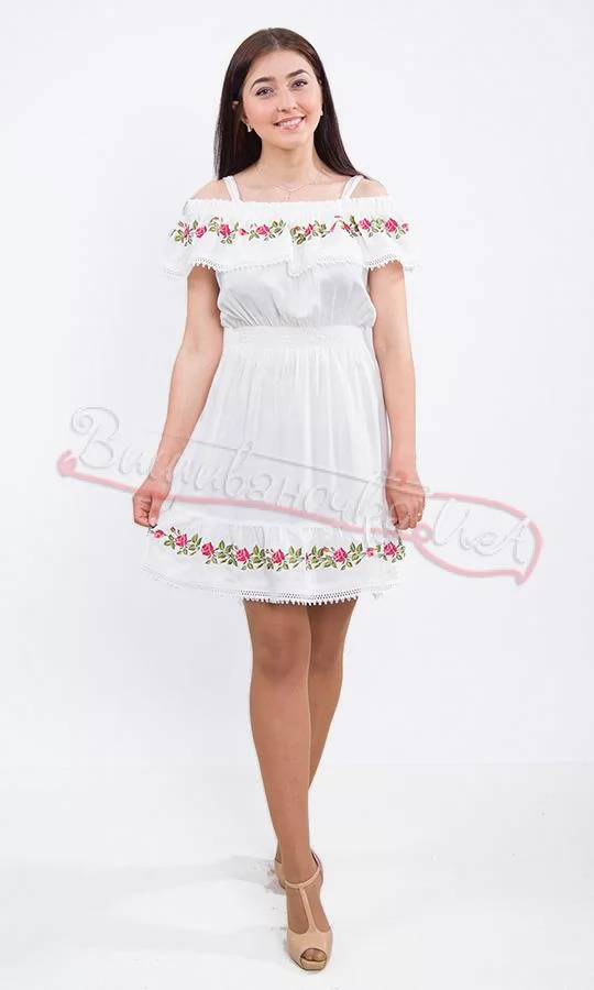 Молодіжне романтичне плаття. Сукенка підійде для прогулянки, пляжу та навіть для святкової події. Модель виготовлена з штапелю, ніжна вишивка квітів розміщена на плечах та нижній руші плаття. Замовити цю річ можна за  стандартними розмірами згідно таблиці, або ж за індивідуальними замірами з 20% завдатком чи 100 % передоплатою. Терміни виготовлення узгоджуються з менеджером.