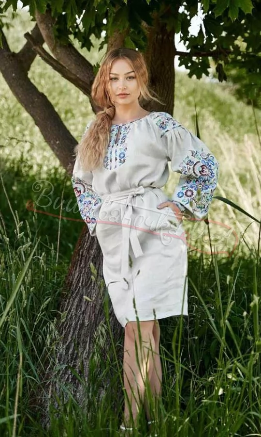 Лляна сукня сірого з квітковою вишивкою. Оригінальний орнамент в стилі петриківського розпису прикрашає пишні рукави, перед плаття та поділ спідниці. В комплекті є довгий пояс.