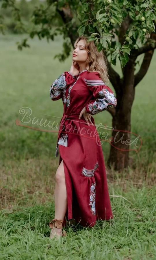 Довга сукня з льону бордового кольору. Квітковий орнамент, нанесений за допомогою машинної вишивки, нагадує петриківський розпис. Вишивка щедро прикрашає пишні рукава, зібрані широкими манжетами, плечі, зону декольте та поділ спідниці. У комплекті із сукнею йде довгий пояс із китицями.