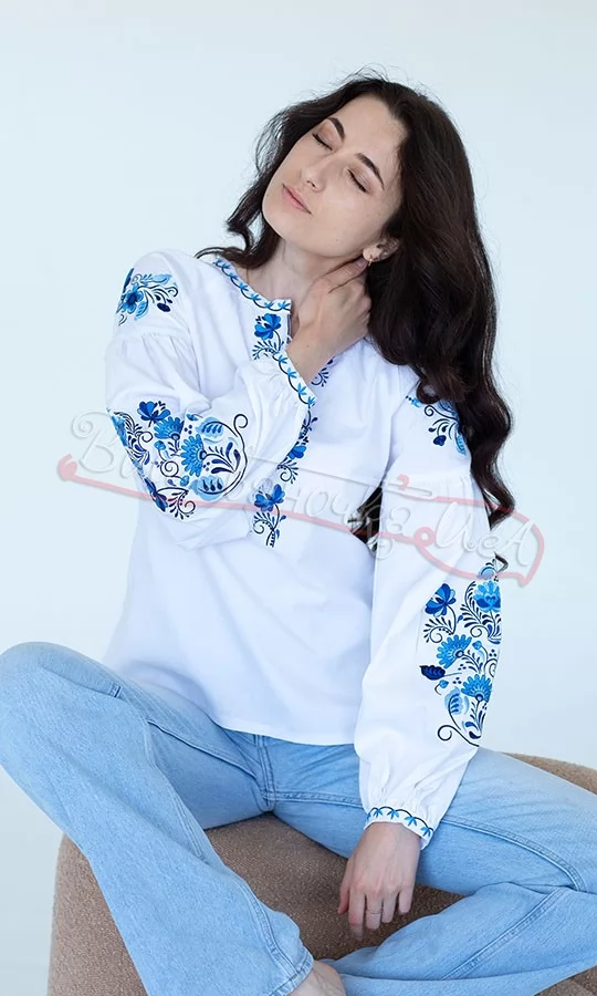 Жіноча блуза на білому полотні з багатим квітковим узором на рукавах. Тканина - бавовняна (98% бавовна, 2% поліестер), вишивка - гладдю.