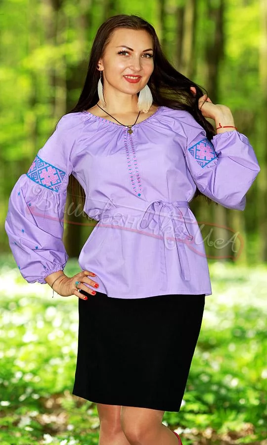 Фіолетова вишита блузка з пояском 6999