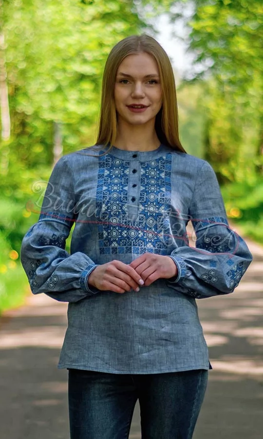 Жіноча блуза на довгий рукав під колір джинсу. Тканина - льон. Вишивка - машинна хрестиком.