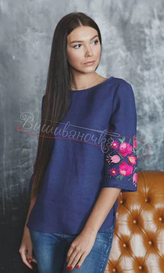 Блуза жіноча з яскравим узором квітів. Тканина - 100% льон. Колір полотна - синій.
