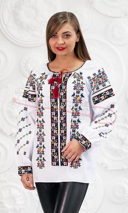 Жіноча яскрава вишита сорочка. Вишитий орнамент щедро прикрашає усю вишиванку, що робить її по-особливому вишуканою. Горловина та манжети прикрашені червоними китицями. Вишиванка виглядає неймовірно та святково. Можливий індивідуальний пошив.