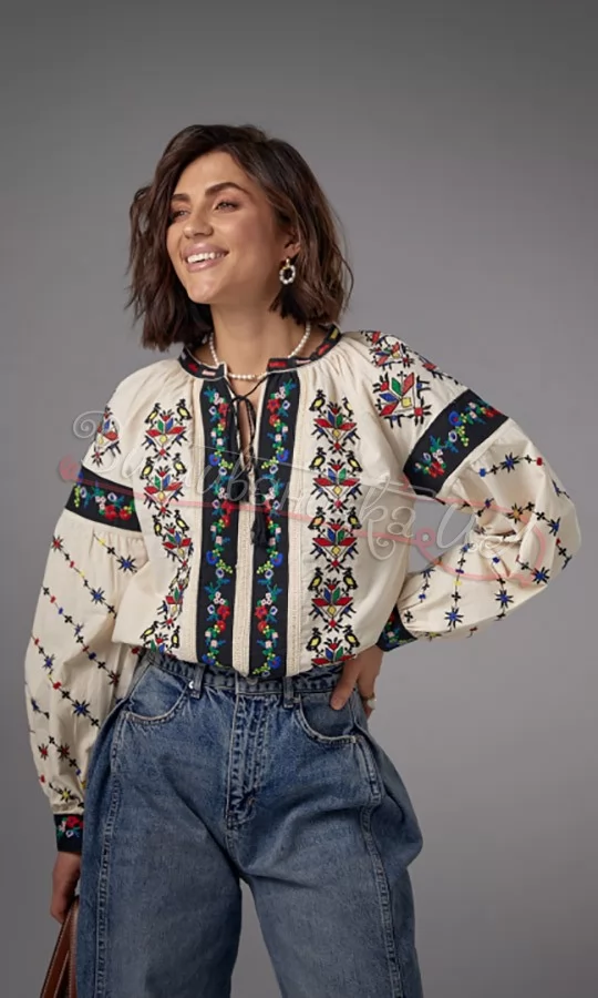 У моделі низ прямий, кругла широка горловина обшита вузькою окантовкою і спереду доповнена розрізом із зав'язками. Довгі рукави-реглани внизу зібрані на манжет з ґудзиком, а вгорі прикрашені кокеткою. Передня центральна частина блузи, а також рукави повністю декоровані візерунками з машинної вишивки гладдю. Також спереду на виробі є дві вертикальні вставки чорного кольору з вишивкою, які з боків доповнені стрічками "макраме". Тканина - 80% бавовна, 20% поліестер.
