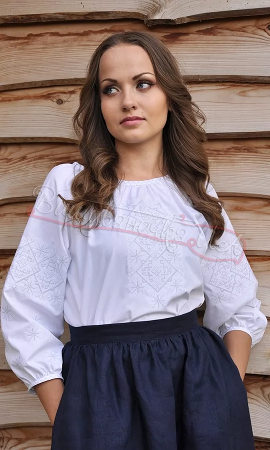 Жіноча вишиванка з білої бавовни з ніжною білою машинною вишивкою. Прекрасний варіант для святкового дійства. Рукав у вишиванки 3\4. Замовте вишиванку і ми доставимо її у будь-яке місто України. Для створення сімейного комплекту вишиванок також можна замовити дитячі вишиванки - ДМ01, ДД01, а також чоловічу вишиванку.