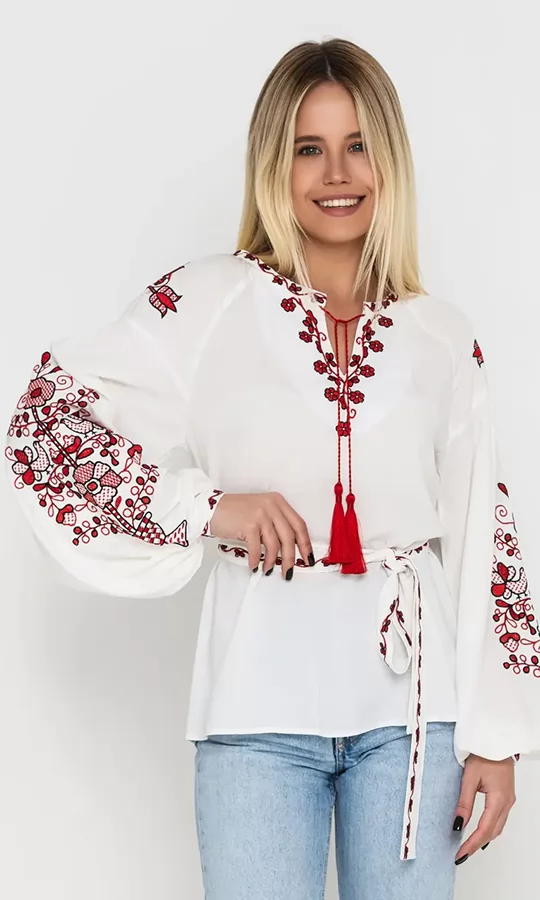 Жіноча вишиванка з червоним яскравим узором.Тканина - штапель, вишивка - гладдю.