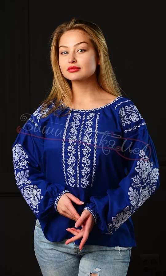 Яскрава жіноча вишиванка в синьому кольорі. Контрастний білий узор щедро прикрашає перед сорочки та рукава. Модель сорочки чудово підійде як варіант святкового одягу.